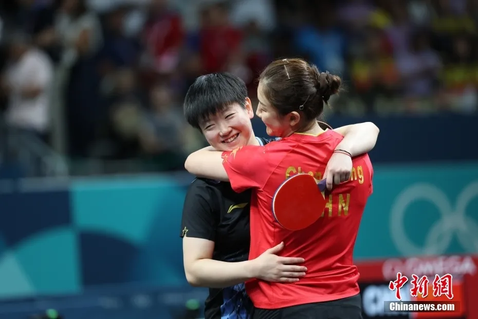 当地时间8月3日,在巴黎奥运会乒乓球女子单打比赛中,中国选手陈梦4-2胜中国选手孙颖莎,获得金牌。图为陈梦(右)、孙颖莎赛后拥抱。中新社记者 盛佳鹏 摄