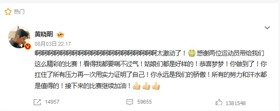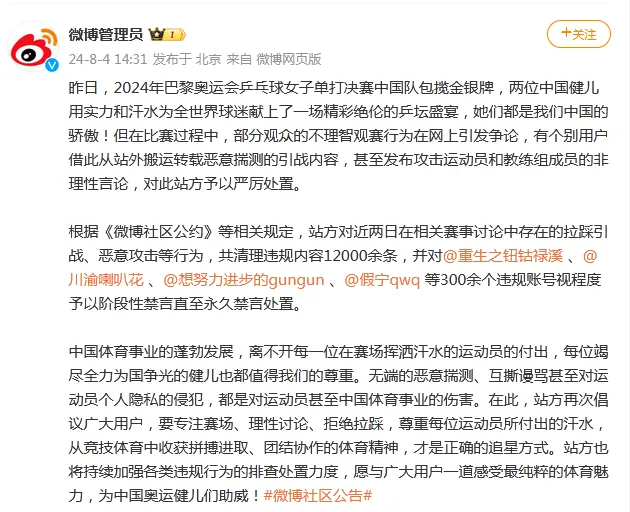 4日,微博管理员发文:3日,2024年巴黎奥运会乒乓球女子单打决赛中国队包揽金银牌,两位中国健儿用实力和汗水为全世界球迷献上了一场精彩绝伦的乒坛盛宴,她们都是我们中国的骄傲!但在比赛过程中,部分观众的不理智观赛行为在网上引发争论,有个别用户借此从站外搬运转载恶意揣测的引战内容,甚至发布攻击运动员和教练组成员的非理性言论,对此站方予以严厉处置。