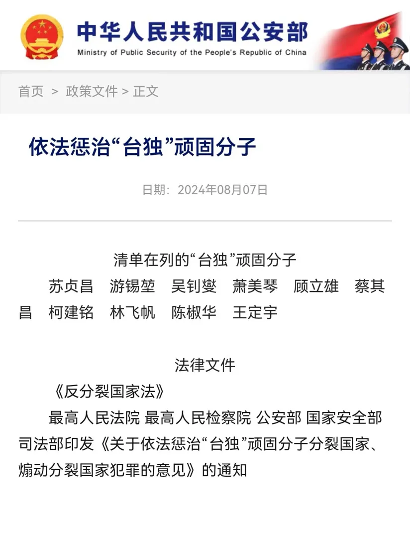 同日,公安部政府网站也新增了“依法惩治‘台独’顽固分子”页面。
