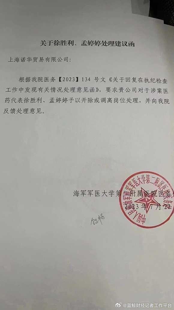 就在7日晚间,网传图片显示,近日海军军医大学第二附属医院(又名“上海长征医院”)分别向上海诺华贸易有限公司和北京诺华制药有限公司发送处理建议函。处理建议函中写明,长征医院根据《关于回复在执纪检查工作中发现有关情况处理意见函》,要求上述两家公司分别对涉案医药代表徐胜利、孟婷婷,陈梦玮、李小娟予以开除或调离岗位处理,并且向该院反馈处理意见。