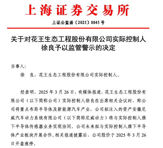 上交所称,经查明,2025年3月26日,有媒体报道,ST花王实际控制人徐良在出席相关会议时,称公司将重点布局半导体及新能源汽车产业,公司拟注入的资产安徽尼威汽车动力系统有限公司(以下简称“尼威动力”)将与实际控制人旗下半导体传感器业务实现协同。公司未来拟与实际控制人旗下半导体产业板块开展合作。相关报道披露后,公司股价于2025年3月26日开盘涨停。