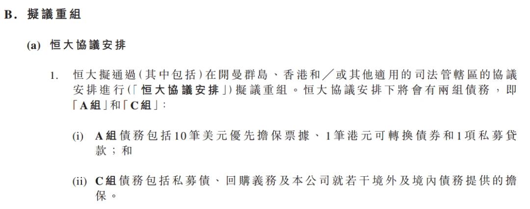 其中,中国恒大拟通过在开曼群岛、香港等适用司法管辖区的协议安排,进行“恒大协议安排”拟议重组。恒大协议安排下将有两组债务,即A组和C组。