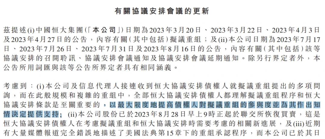 8月28日,中国恒大公告称,恒大协议安排会议的举办时间,延期至9月26日。