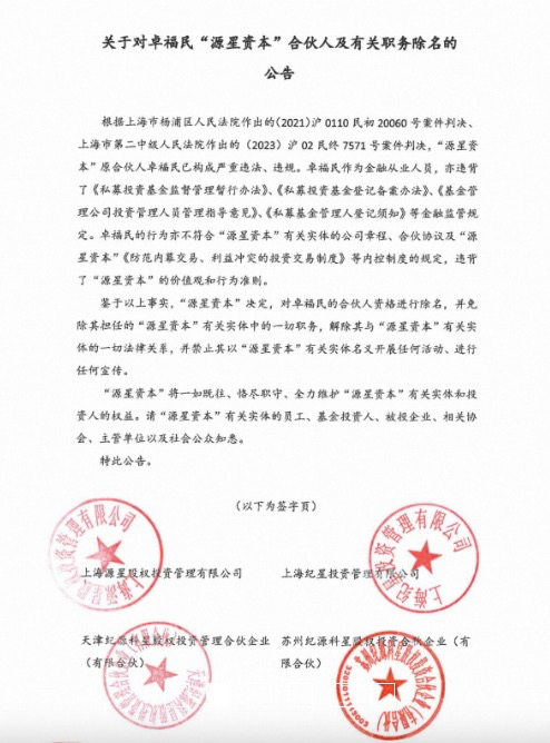 近日,源星资本(V Star Capital)在官网发布了一则盖有19个公章的公告,称根据法院判决,“源星资本”原合伙人卓福民已构成严重违法、违规,鉴于此,源星资本决定对卓福民的合伙人资格进行除名,并免除其担任的“源星资本” 有关实体中的一切职务,解除其与“源星资本”有关实体的一切法律关系,并禁止其以“源星资本”有关实体名义开展任何活动、进行任何宣传。