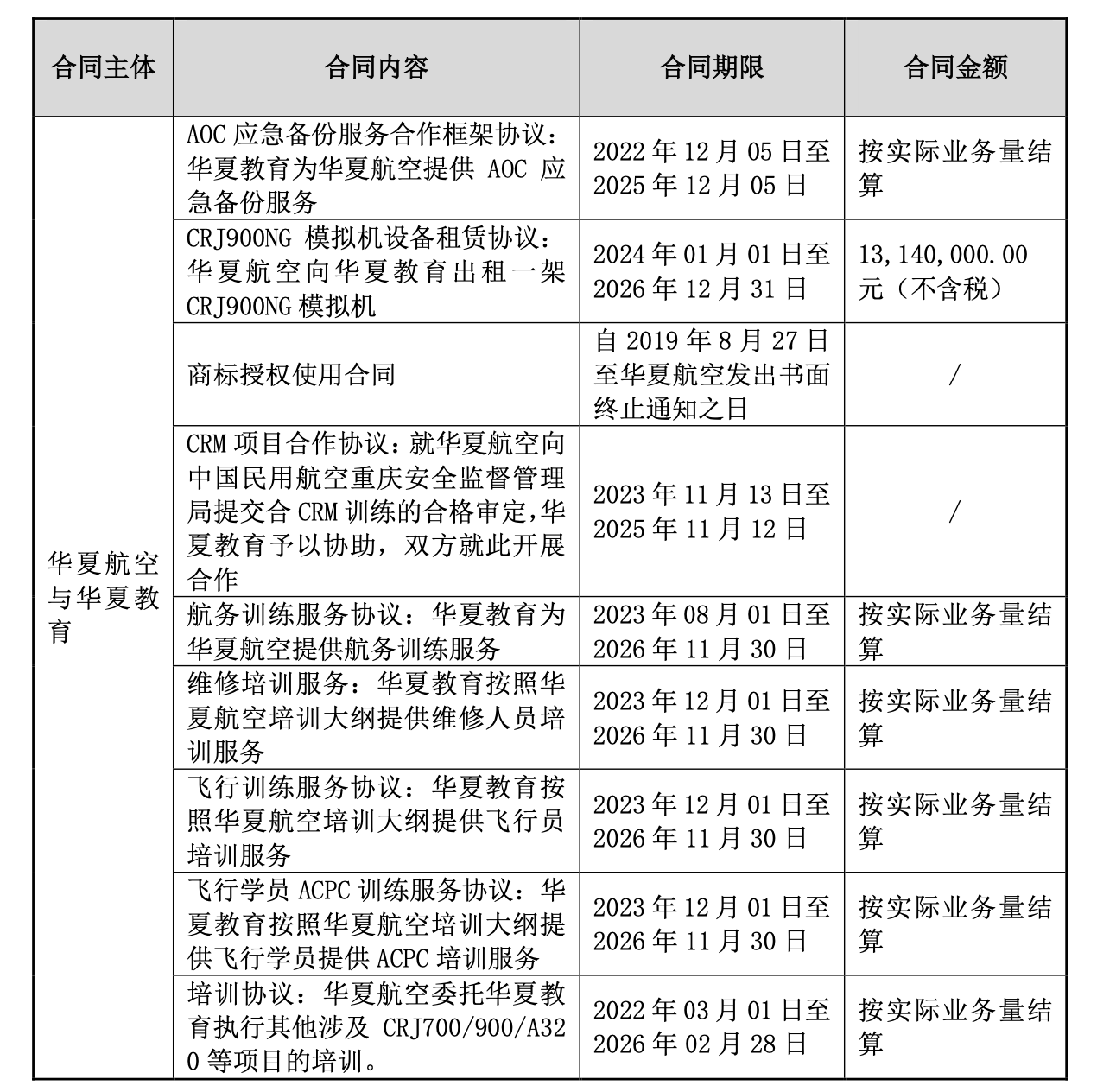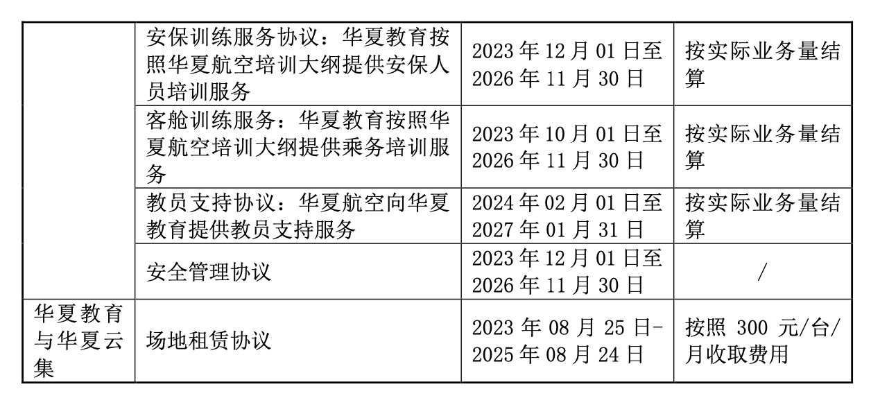 截至本公告披露日,公司与华夏教育已签订且正在履行的合同,主要包括AOC应急备份服务合作框架协议、CRJ900NG模拟机设备租赁协议、商标授权使用合同、CRM项目合作协议、航务训练服务协议、维修培训服务、飞行训练服务协议、飞行学员ACPC训练服务协议、培训协议、安保训练服务协议、客舱训练服务、教员支持协议、安全管理协议等。