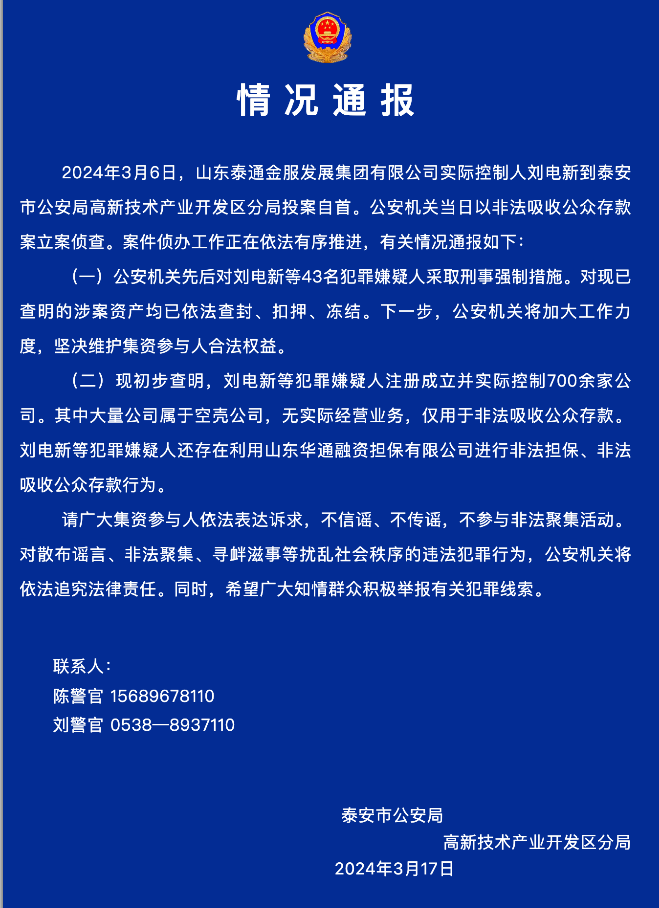 2024年3月6日,山东泰通金服发展集团有限公司(下称“泰通金服”)实际控制人刘电新到泰安市公安局高新技术产业开发区分局投案自首。公安机关当日以非法吸收公众存款案立案侦查。案件侦办工作正在依法有序推进,有关情况通报如下: