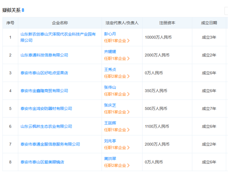 天眼查显示,与泰通金服有疑似关系的企业共8家,不是与泰通金服备案了相同的电话就是备案了相同的地址。