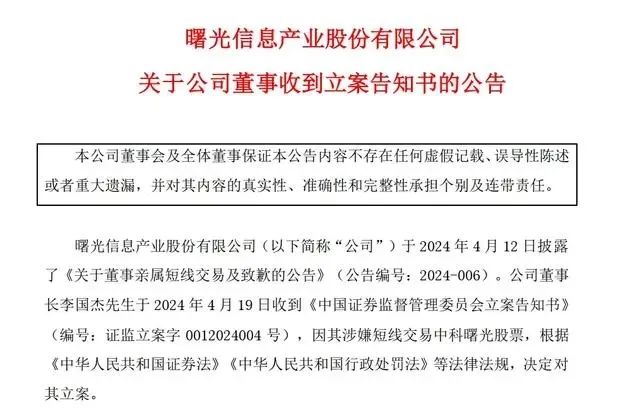 4月19日晚间,中科曙光(603019.SH)公告称,董事长李国杰于当日收到《中国证券监督管理委员会立案告知书》,因其亲属涉嫌短线交易中科曙光股票,根据《中华人民共和国证券法》《中华人民共和国行政处罚法》等法律法规,决定对其立案。公司表示,本次立案系对李国杰个人的调查,不会对公司董事会运作及公司日常经营活动产生重大影响,公司将持续关注上述事项的进展情况,并按照有关法律、法规的规定履行信息披露义务。