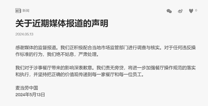 5月13日晚麦当劳中国官网发布《关于近期媒体报道的声明》称正积极配合当地市场监管部门进行调查与核实对于涉事餐厅带来的影响深表歉意。