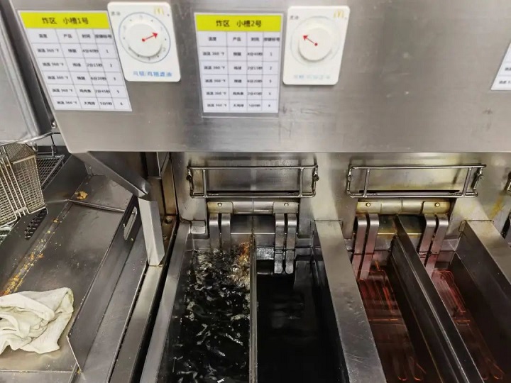 然而在麦当劳郑州卓越农联餐厅后厨的炸区,油槽内的油已经变成了墨色,而且过滤后颜色仍然没有直观的改变。就算如此,值班经理在检测极性组分数值后,并没有要求更换。而当记者质疑为何不换油时,有员工解释称,可能是因为周六、日没有人检查,先用着。