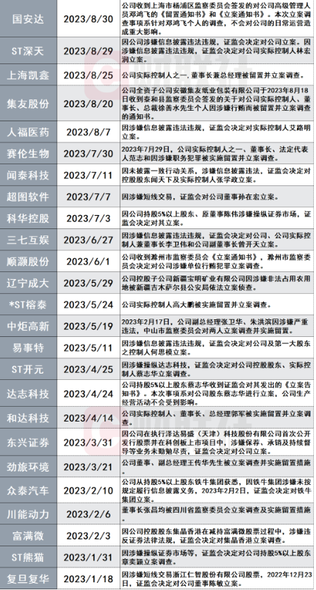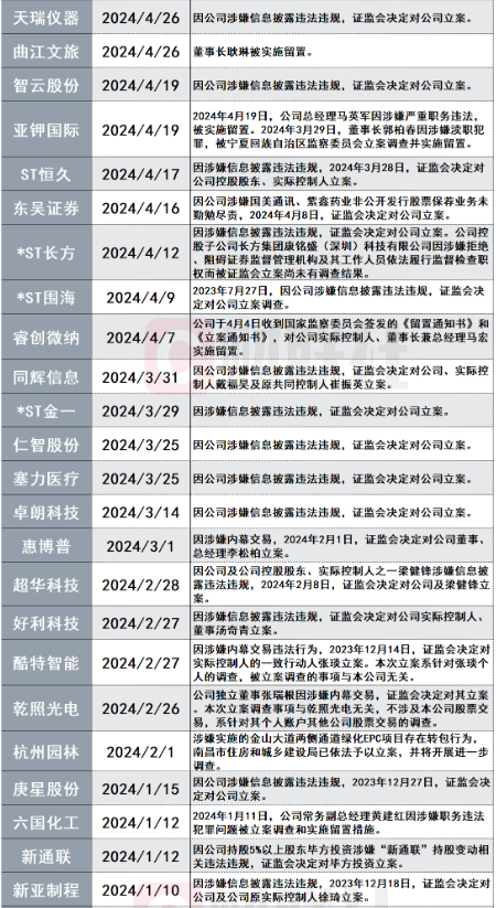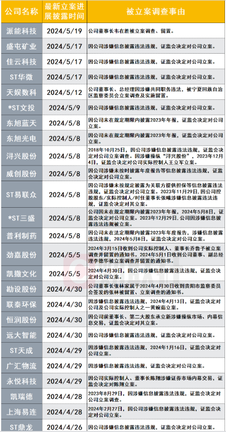 事实上,在上述两家公司之前,特发信息、汇金股份、海峡创新三家公司于5月12日同日公告收到行政处罚决定书,公司股票将被ST,彼时在市场就引起了投资者的高度关注。值得注意的是,这三家公司均在2023年因涉嫌信息披露违法违规被证监会立案。