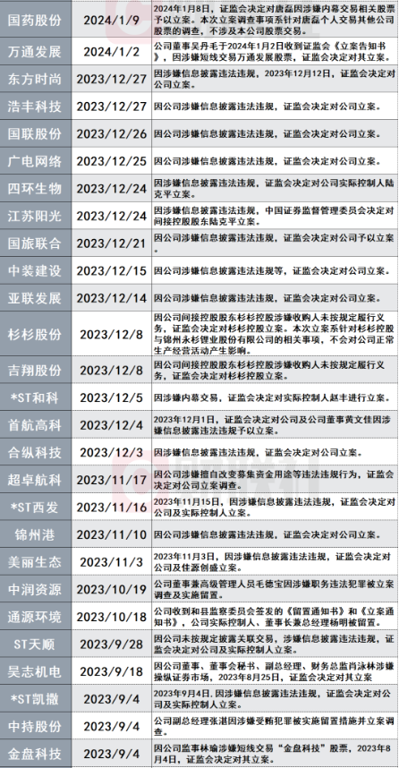 被立案调查的事由方面,上市公司层面,因涉嫌信息披露违法违规被立案是首要原因,2023年以来,因涉嫌信息披露违法违规被立案的上市公司多达50余家,这部分上市公司主要包括盛屯矿业、佳云科技、ST华微、凯撒文化、远大智能、浔兴股份、广汇物流等。