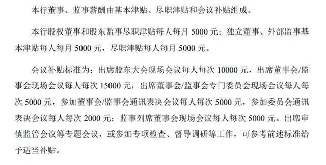 会议补贴标准为:出席股东大会现场会议每人每次10000元,出席董事会/监事会现场会议每人每次15000元,出席董事会/监事会专门委员会现场会议每人每次5000元,参加董事会/监事会通讯表决会议每人每次5000元,参加委员会通讯表决会议每人每次2000元;监事列席董事会现场会议每人每次5000元。
