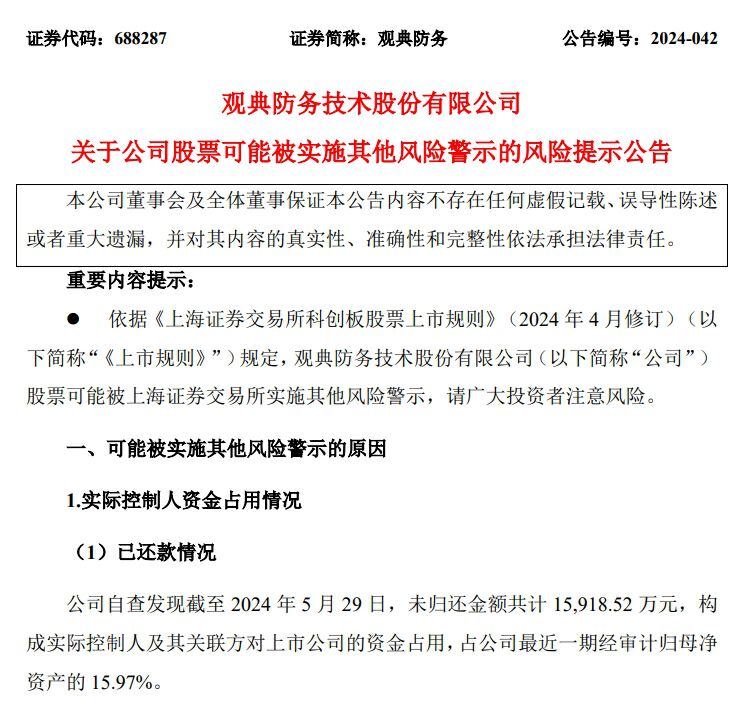 公司自查发现截至2024年5月29日,实际控制人及其关联方对上市公司的资金占用未归还金额共计1.59亿元,占公司最近一期经审计归母净资产的15.97%。