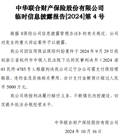 日前,中华联合财险发布公告称,该公司因信用保证保险纠纷案件于 2024 年 9 月 29 日收 到浙江省杭州市中级人民法院下达的民事判决书(2024 浙 01 民终 4785 号),根据判决该公司辽宁分公司需支付保险理赔款、违约金及其他相关费用,合计支付金额预计超过人民币5000万元。