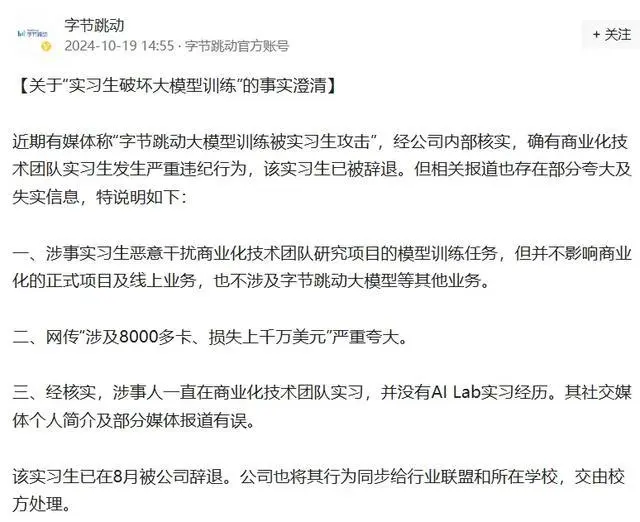 值得注意的是,这份内部《通报》中,字节跳动还披露了近期受到外界关注的实习生破坏模型训练事件。《通报》称,2024年6月至7月,商业产品与技术前实习员工田某某,因对团队资源分配不满,通过编写、篡改代码等形式恶意攻击团队研究项目的模型训练任务,造成资源损耗。公司已与其解除实习协议,同步阳光诚信联盟及企业反舞弊联盟,并同步至其就读学校处理。