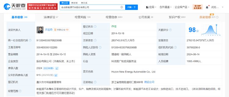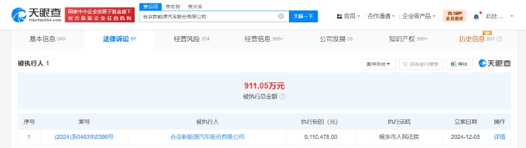 眼查法律诉讼信息显示,近日,哪吒汽车关联公司合众新能源汽车股份有限公司新增一条被执行人信息,执行标的911万余元,执行法院为桐乡市人民法院。