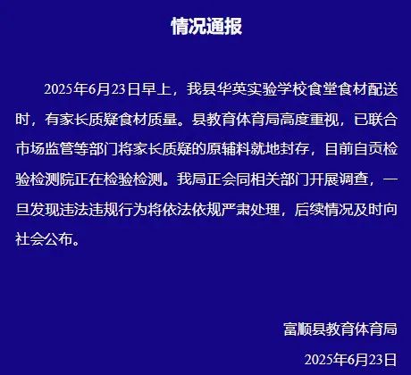 6月23日,四川自贡富顺县教育体育局通报:2025年6月23日早上,我县华英实验学校食堂食材配送时,有家长质疑食材质量。县教育体育局高度重视,已联合市场监管等部门将家长质疑的原辅料就地封存,目前自贡检验检测院正在检验检测。我局正会同相关部门开展调查,一旦发现违法违规行为将依法依规严肃处理,后续情况及时向社会公布。