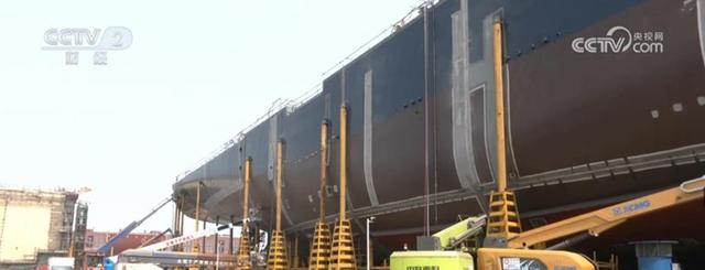 在上海的一家造船厂,一艘7600车汽车运输船已经完成分段建造,正在船台进行搭载焊接。