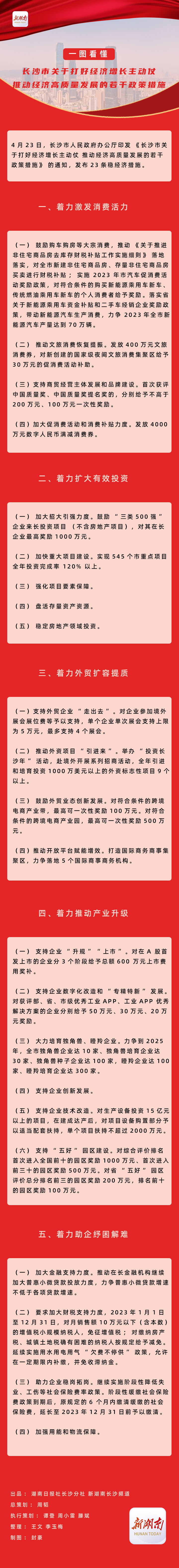 4月23日,由长沙市发展改革委牵头起草的《长沙市关于打好经济增长主动仗推动经济高质量发展的若干政策措施》正式印发,围绕促消费、稳投资、扩外贸、强产业、扶实体5个方面推出23条具体政策措施,进一步提振市场信心、稳定社会预期。