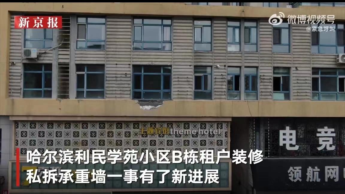 此前媒体报道,哈尔滨市松北区利民学苑小区一租户在3楼装修时砸掉承重墙,导致大楼从下往上出现裂缝,楼内二百余户居民被紧急撤离,临时安置到酒店。5月9日,哈尔滨市松北区政府发布消息,哈尔滨市委市政府成立事件调查组,市区两级组建工作专班,连夜对该事件进行调查处置。同时,委托国家和省级权威检测机构开展调查、鉴定、处置等全面技术工作。根据检测机构和专家组意见,对拆改的墙体采取局部支护等应急处置措施,防止结构构件损伤及变形进一步发展。