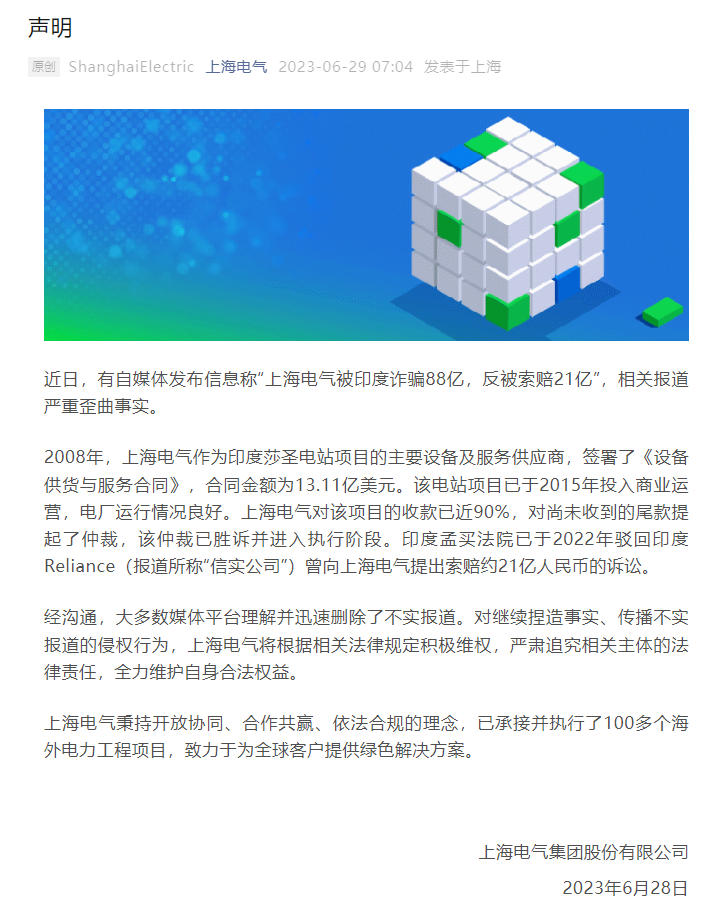 6月28日,上海电气发布声明称,近日,有自媒体发布信息称“上海电气被印度诈骗88亿,反被索赔21亿”,相关报道严重歪曲事实。