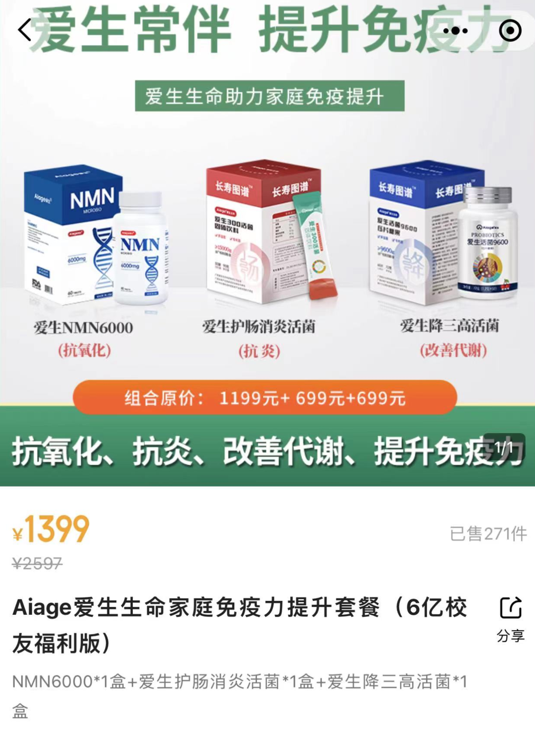 据红星新闻,在微信商城内,爱生生命益生菌产品销量最好的是一款售价220元的调节肠胃便秘即食型益生菌,已售1.02万盒,其他多款益生菌产品销量数百到数千不等,价格由200元到700元不等。其中一款包含三种产品的家庭套餐打出“6亿校友福利版”的宣传。