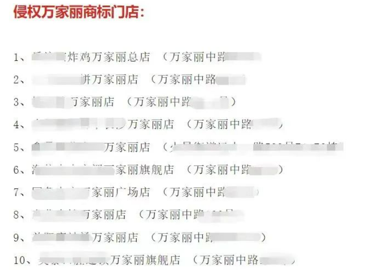 万家丽维权公告中的线下侵权店铺名单(部分)