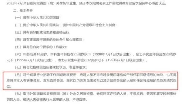 这一热点,源于近日山东省烟草专卖局(公司)发布的2023年高校毕业生招聘公告。山东烟草专卖局发布的2023年高校毕业生招聘公告要求,应聘人员不得应聘录用后即构成干部任职回避情形的岗位,也不得应聘与本人有夫妻关系、直系血亲关系、三代以内旁系血亲关系以及近姻亲关系的人员担任领导成员的单位系统的岗位。