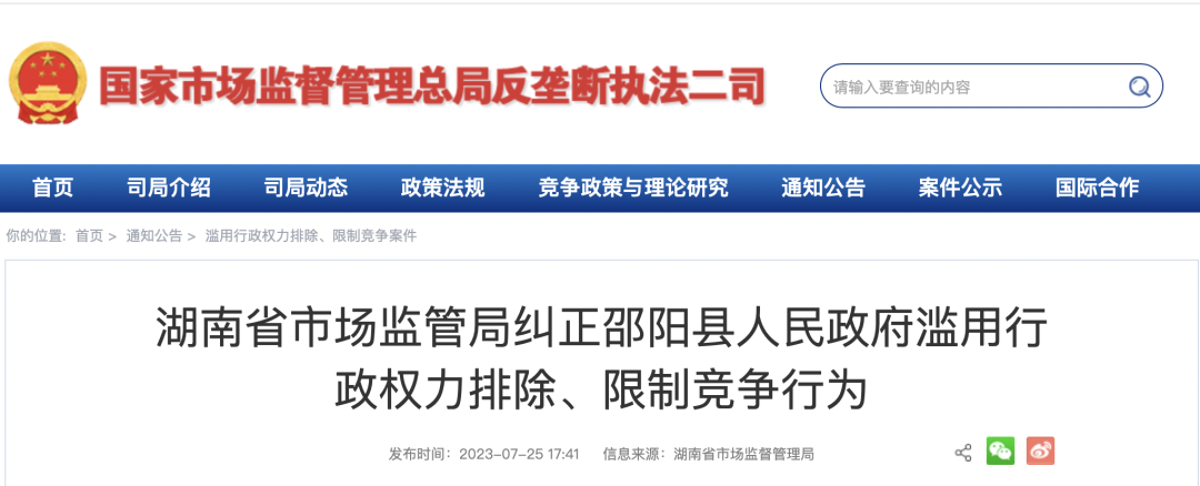 2023年1月17日,湖南省市场监管局对邵阳县人民政府涉嫌滥用行政权力排除、限制竞争行为进行立案调查。