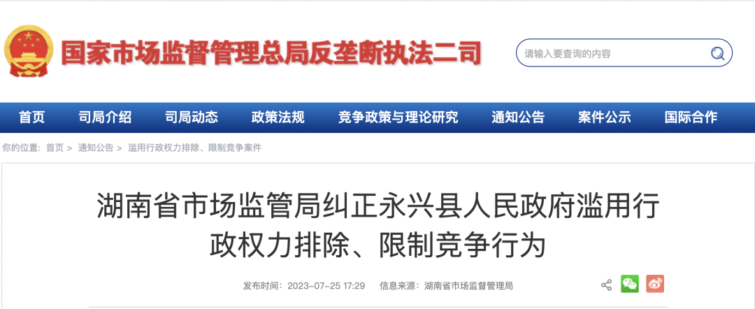 2022年1月10日,湖南省市场监管局对永兴县人民政府涉嫌滥用行政权力排除、限制竞争行为进行立案调查。