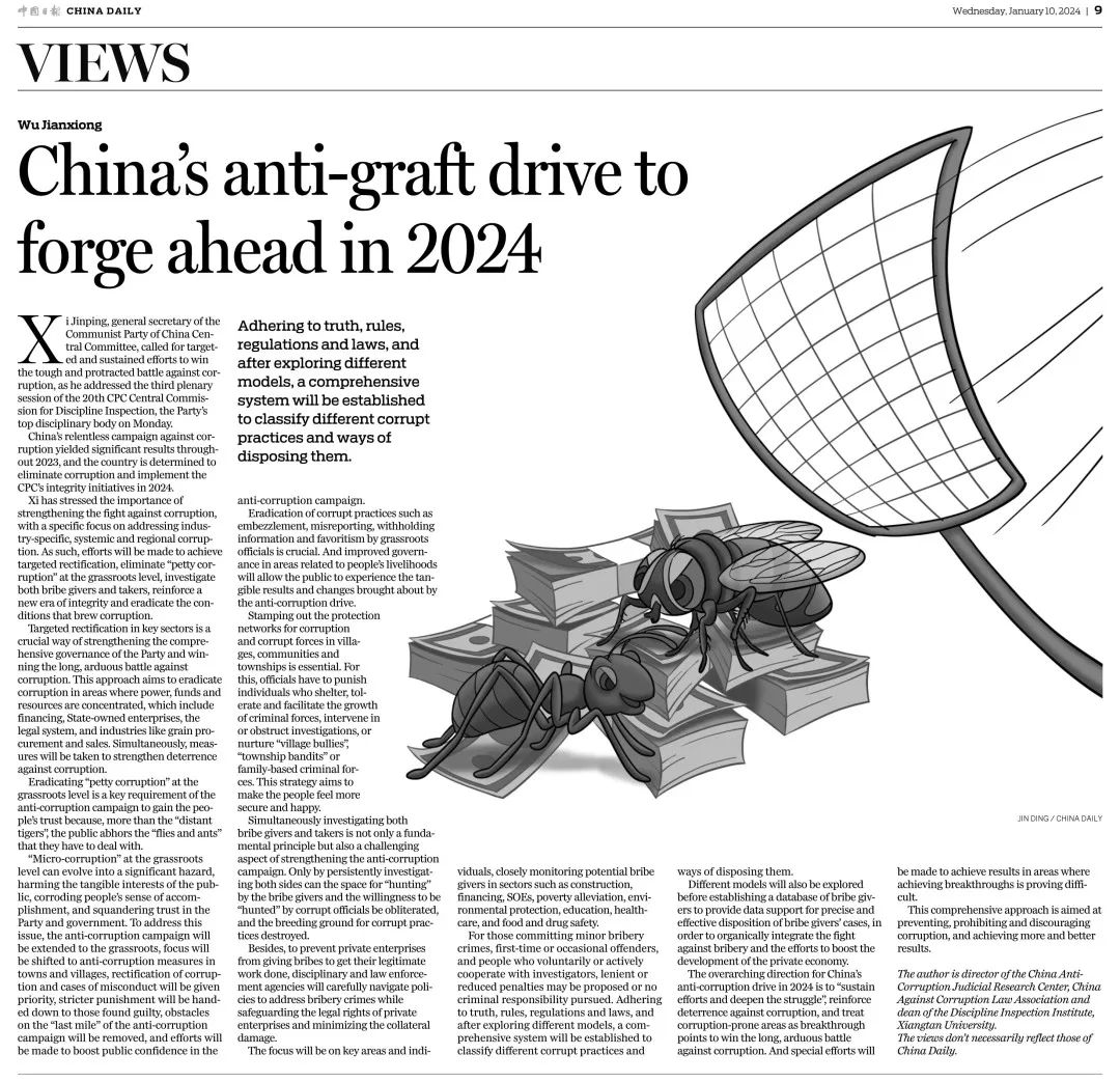 院长吴建雄教授应《中国日报》之约就2024年中国反腐败斗争展望撰文,对强化专项整治、严查"蝇贪蚁腐"、深化源头治理提出见解。2024年1月10日,在《中国日报》重磅刊出。
