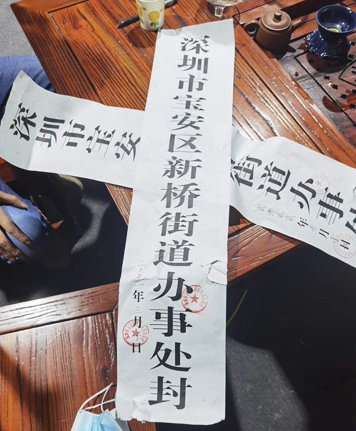 而就在凤来栖公司停止付款后不久,2022年3月,新桥街道执法队上星片区组长曾向荣带着执法人员来到了施工现场,叫停了现场施工,并在装修现场贴上了封条。谭海刚后来了解到,执法人员查封装修施工现场的理由是“未办理备案手续”。
