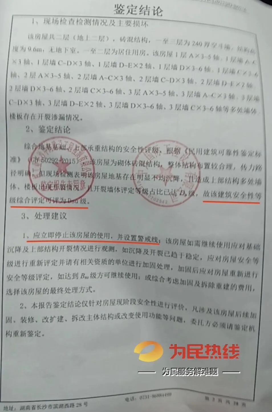 廖先生说, 情况不严重的,很快协商得到处理。但是,包括廖先生家在内的3户人家,房子震裂严重,株洲天元区三门镇政府找了权威机构鉴定,廖先生家房屋的鉴定结果是D级,属于危房,不能住人。