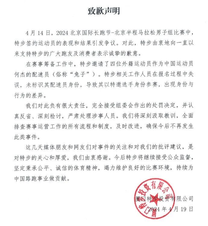 4月19日下午,特步在官方微博发布《致歉声明》。声明称,在赛事筹备工作中,特步邀请了四位外籍运动员作为中国运动员何杰的配速员(俗称“免子”)。特步相关工作人员在报名过程中失误,未标识其配速员身份,导致其以特邀选手身份参赛,出现身份与行为的差异。
