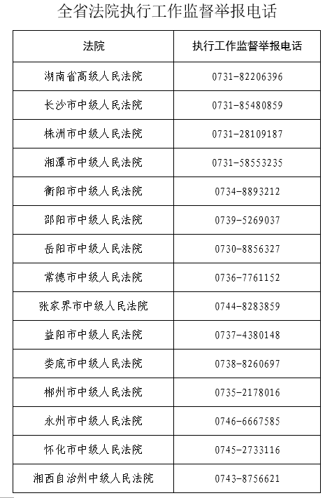 湖南法院向社会承诺:执行案件立案后,必须首先开展线上财产“五查”(查银行存款、查不动产、查车辆、查工商登记、查证券)。无法定事由的,执行案款到账后于15个工作日内予以发放。如违反以上两项承诺,可向省法院及各中院执行局监督举报。举报电话附后。