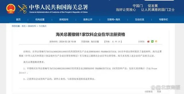 海关总署官网发布公告称,经核实,在华注册的美国饮料生产企业JERRY&SONS PHARMACEUTICAL INC在申请注册时提供了虚假材料,已撤销该企业在华注册资格。