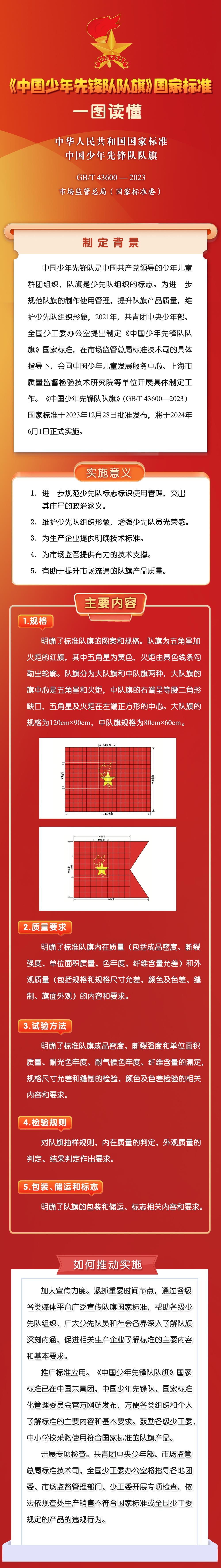 《中国少年先锋队队旗》(GB/T 43600—2023)国家标准将于2024年6月1日正式实施。该标准由市场监管总局(国家标准委)批准发布,共青团中央、全国少工委会同相关单位编制。