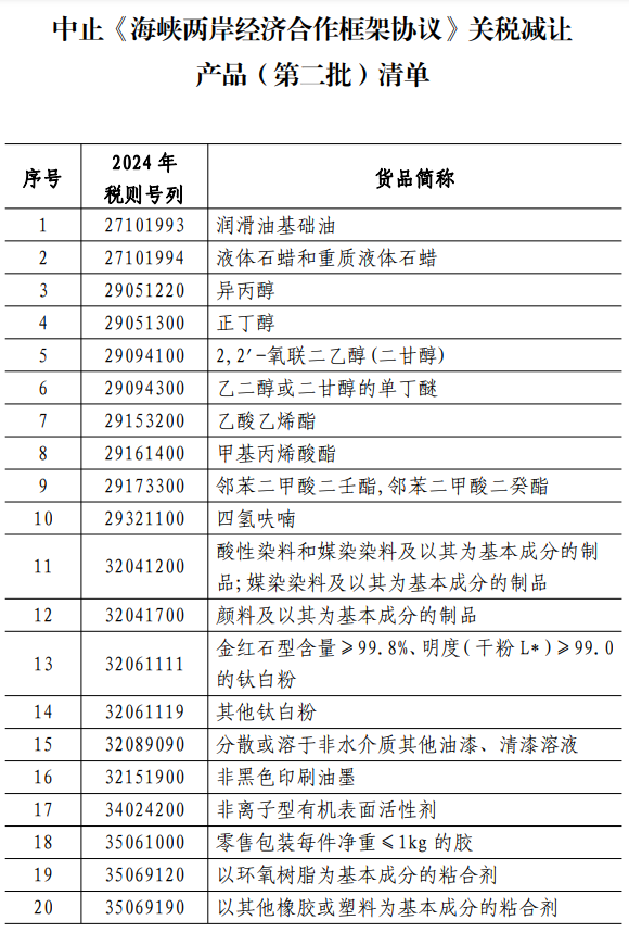 国务院关税税则委员会关于中止《海峡两岸经济合作框架协议》部分产品(第二批)关税减让的公告