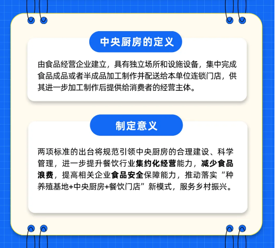 《中央厨房 建设要求》给出了中央厨房选址与总体布局、加工区场所设置、主体建设、设施设备四个方面的要求,引领中央厨房合理建设、科学投资。《中央厨房 运营管理规范》从设施设备管理、经营加工过程、安全与追溯、应急与召回、人员管理、信息记录与档案管理,以及监督、评价与改进等方面,为中央厨房的运营管理提供指导,并对原辅料采购与验收、经营加工、检验与留样、仓储、配送、交付等环节提出具体细化要求。两项标准的实施将进一步提升餐饮业集约化经营能力,培育发展“种养殖基地+中央厨房+餐饮门店”新模式,助力餐饮等相关行业高质量发展。