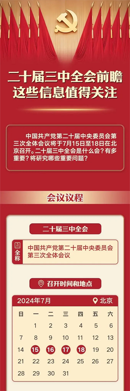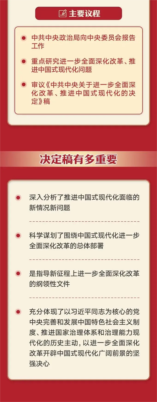 今天(7月15日),中国共产党第二十届中央委员会第三次全体会议在京开幕。会议将重点研究进一步全面深化改革、推进中国式现代化问题,对围绕中国式现代化进一步全面深化改革作出总体部署。