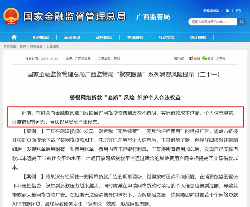近期,有群众向金融监管部门反映通过网络贷款遇到息费不透明、实际借款成本过高、个人信息泄露、过度借贷等问题,合法权益受到严重侵害。