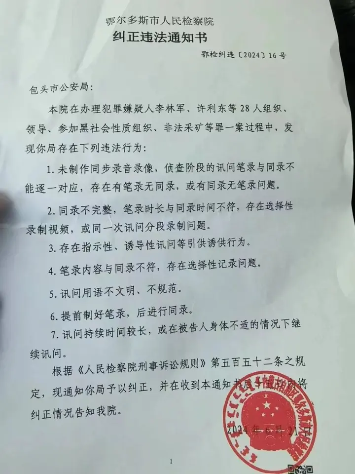重新审理期间,鄂尔多斯市人民检察院作出了变更起诉决定,并向此前负责侦查的包头市公安局发出了《纠正违法通知书》,指出警方办案存在多项违法行为,包括诱供、疲劳审讯等问题。