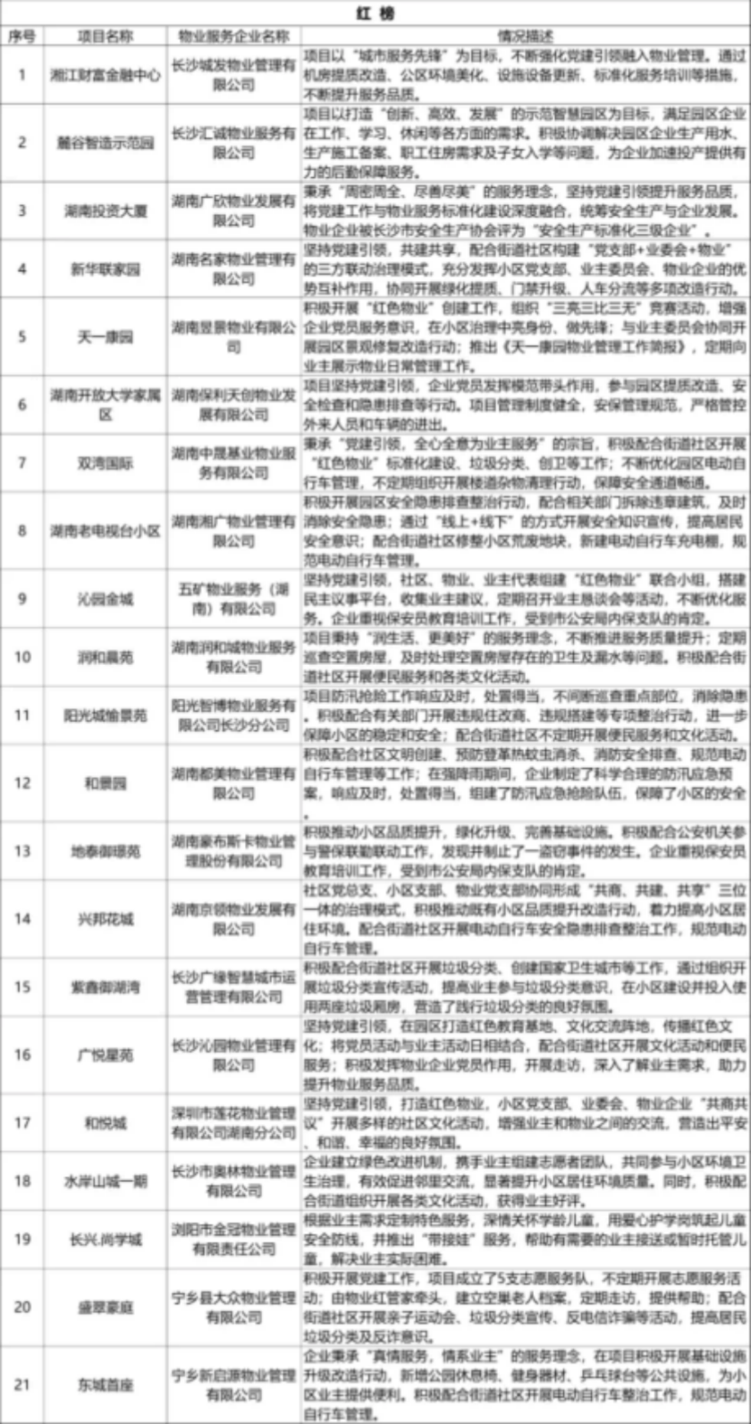 记者看到,除了列明物业服务企业名称和服务项目外,还详细描述了上榜理由。具体而言,按照今年三季度各物业服务企业党建引领、物业标准化建设、文明创建、安全生产、物业企业信用建设、垃圾分类、电动自行车整治、小区违规菜地排查整治等工作情况,表现突出的21家物业企业,被列入“红榜”。