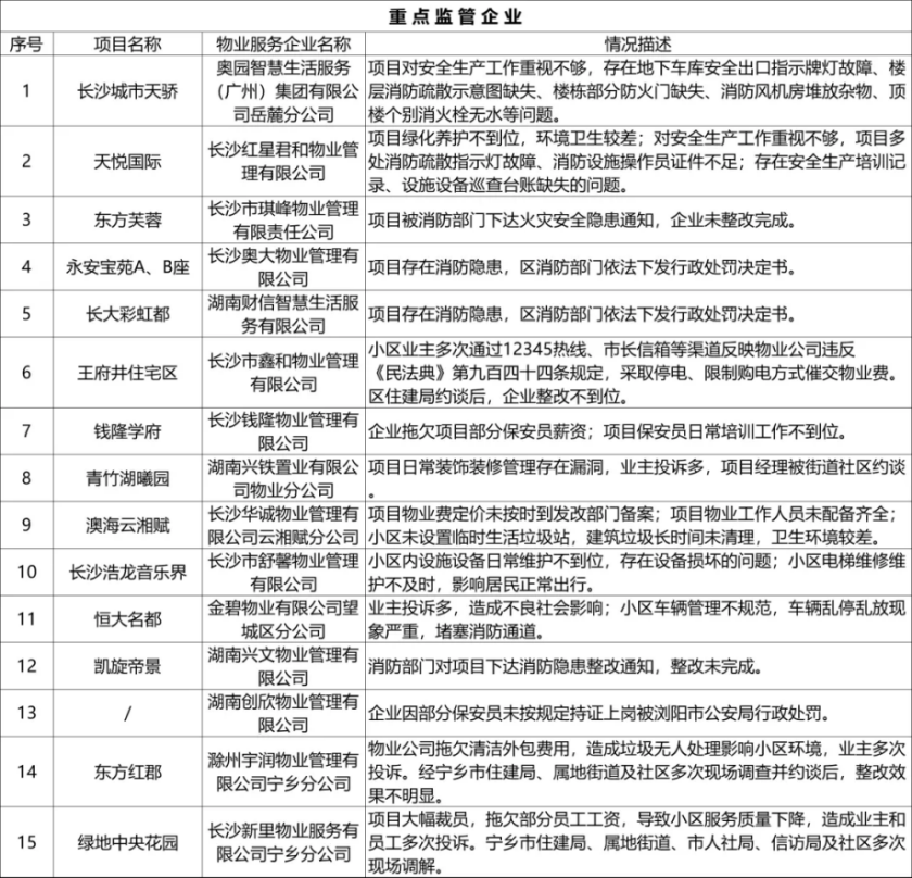 企业针对工作中物业企业被多次举报、投诉的,或发现问题没有及时整改的,15家物业企业被列入“重点监管”范围。