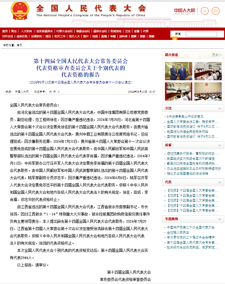 9月13日,中国人大网发布《第十四届全国人民代表大会常务委员会代表资格审查委员会关于个别代表的代表资格的报告》,说明了邓志平被罢免的原因: