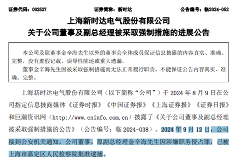 9月13日晚,新时达(5.890, -0.16, -2.64%)公告称,公司于12日接到公安机关通知,公司董事、原副总经理金辛海因涉嫌职务侵占罪,已被上海市嘉定区人民检察院批准逮捕。