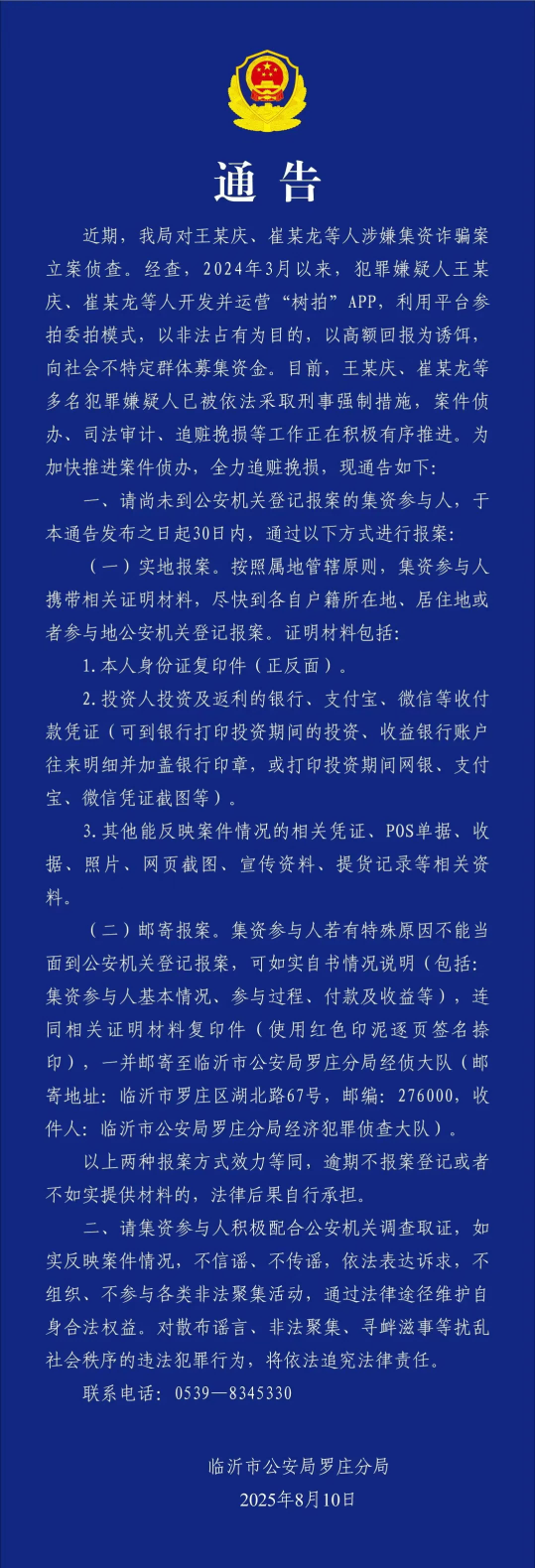 8月10日,山东临沂市公安局罗庄分局发布通告:近期,公安局对王某庆、崔某龙等人涉嫌集资诈骗案立案侦查。经查,2024年3月以来,犯罪嫌疑人王某庆、崔某龙等人开发并运营“树拍”APP,利用平台参拍委拍模式,以非法占有为目的,以高额回报为诱饵向社会不特定群体募集资金。目前,王某庆、崔某龙等多名犯罪嫌疑人已被依法采取刑事强制措施,案件侦办、司法审计、追赃挽损等工作正在积极有序推进。