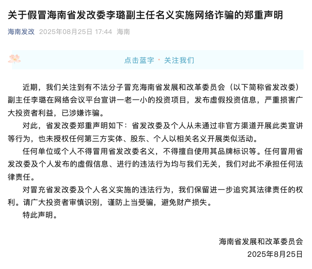 8月25日,海南省发改委发布“关于假冒海南省发改委李璐副主任名义实施网络诈骗的郑重声明”:近期,我们关注到有不法分子冒充海南省发展和改革委员会(以下简称省发改委)副主任李璐在网络会议平台宣讲一老一小的投资项目,发布虚假投资信息,严重损害广大投资者利益,已涉嫌诈骗。