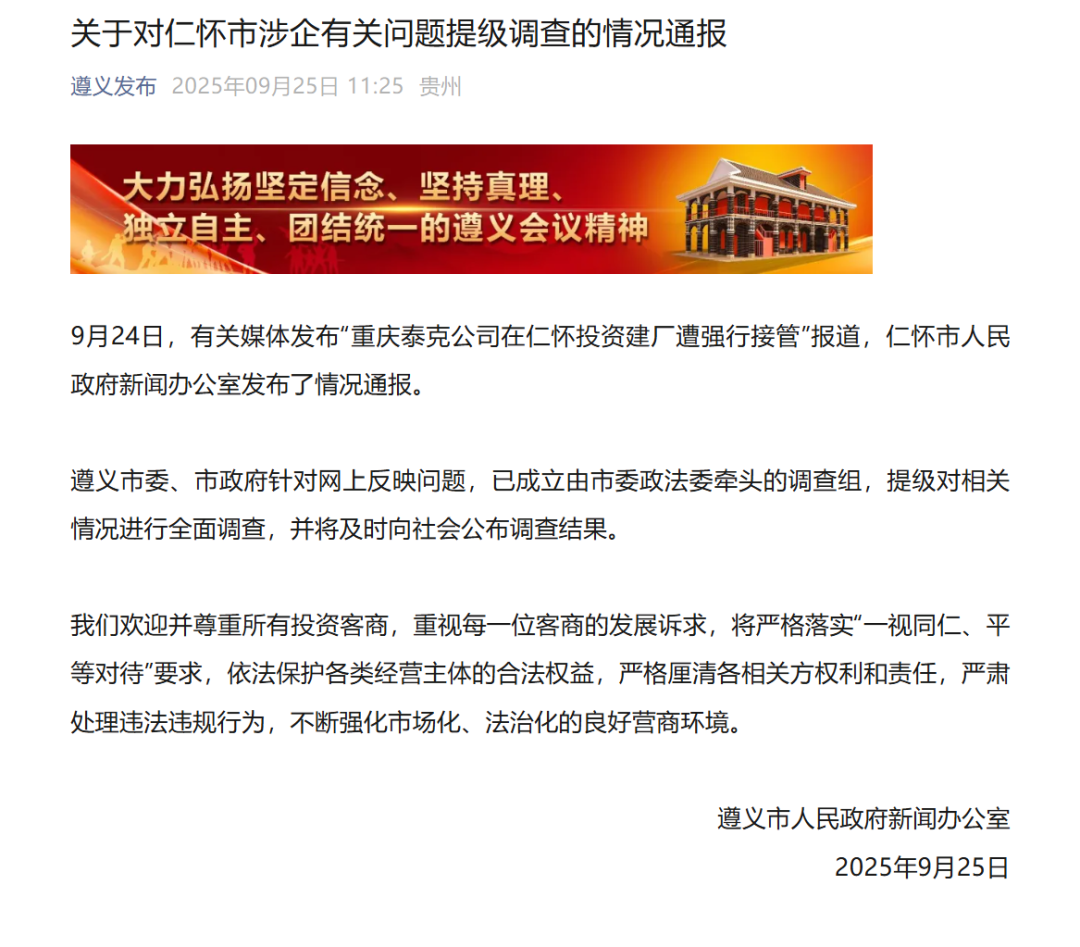 仁怀市在前期工作基础上,已成立专班对该情况展开全面调查,调查结果将及时向社会公布。我市将依法平等保护各类经营主体的合法权益,依法依规清理历史遗留问题,对侵害企业家正当利益的行为严肃追责问责,对采取非法手段谋取不当利益的行为依法查处,着力营造市场化、法治化的营商环境。
